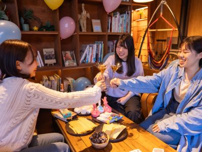 地元ときがわ産の木材を使用している巨大な本棚に囲まれたラウンジでは、地域や木の温かさを感じられます。施設内のパン屋では毎朝焼きたてのパンをお届けします。