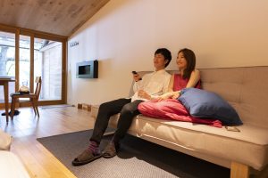 さらに、お部屋にはプロジェクターも完備。ゆったりと映画を鑑賞したり、お持ちのゲーム機に繋いで大画面でお楽しみいただくこともできます。